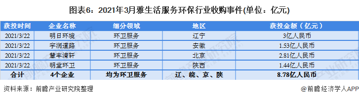 值得注意的是排名第五的投融資事件,由雅生活服務(wù)出資3億元收購(gòu)明日環(huán)境。雅生活服務(wù)在同天斥8.78億人民幣收購(gòu)了4家環(huán)衛(wèi)服務(wù)相關(guān)企業(yè),分別是明日環(huán)境、宇潤(rùn)道路、慧豐清軒和明堂環(huán)衛(wèi)。