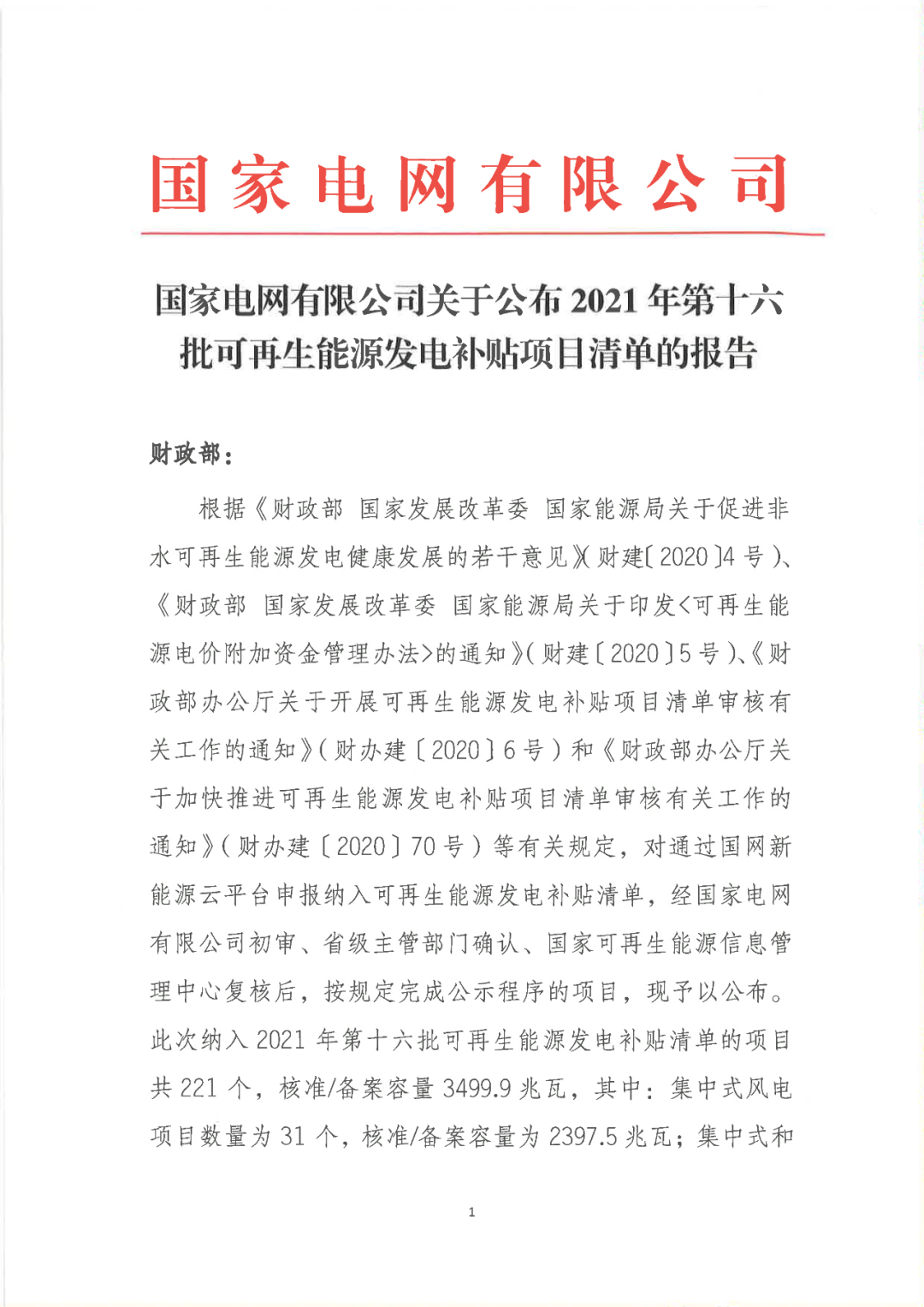 關于公布2021年第十六批可再生能源發(fā)電補貼項目清單的公告
