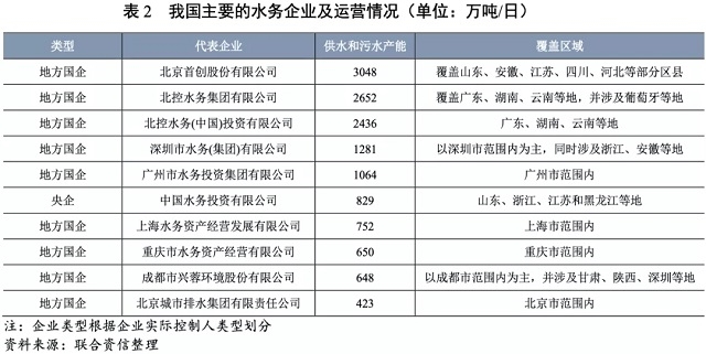水務(wù)企業(yè)類(lèi)型和競(jìng)爭(zhēng)格局方面,目前,我國(guó)行業(yè)內(nèi)分布的水務(wù)企業(yè)大致可分為三種,國(guó)有水務(wù)企業(yè)(央企和地方國(guó)企)、外商投資水務(wù)企業(yè)和民營(yíng)水務(wù)企業(yè)。其中,國(guó)有地方水務(wù)企業(yè)較為普遍,多為所在地方原事業(yè)單位改制形成,其業(yè)務(wù)結(jié)構(gòu)相對(duì)單一,以服務(wù)所在區(qū)域供水和污水處理為主業(yè),區(qū)域壟斷性突出,是水務(wù)行業(yè)的主力軍。部分實(shí)力較強(qiáng)的區(qū)域(北京、深圳、成都、重慶等地)地方國(guó)有水務(wù)企業(yè)和央屬水務(wù)企業(yè)基于雄厚的股東背景、資金實(shí)力和技術(shù)水平,通過(guò)并購(gòu)、合資、參控股、BOT和PPP等手段在全國(guó)范圍內(nèi)或國(guó)外異地?cái)U(kuò)張,獲取供水和污水處理業(yè)務(wù)特許經(jīng)營(yíng)權(quán),并通過(guò)水務(wù)衍生行業(yè)拓展成為投資型綜合水務(wù)企業(yè),對(duì)原區(qū)域內(nèi)地方水務(wù)企業(yè)產(chǎn)生一定競(jìng)爭(zhēng)。外資水務(wù)企業(yè)往往擁有水務(wù)技術(shù)和較高的管理水平,但進(jìn)入中國(guó)水務(wù)市場(chǎng)數(shù)量較少。民營(yíng)水務(wù)企業(yè)所占市場(chǎng)份額較小,主要通過(guò)PPP模式在污水處理和水環(huán)境治理領(lǐng)域參與競(jìng)爭(zhēng),面臨較大投資和回款壓力。