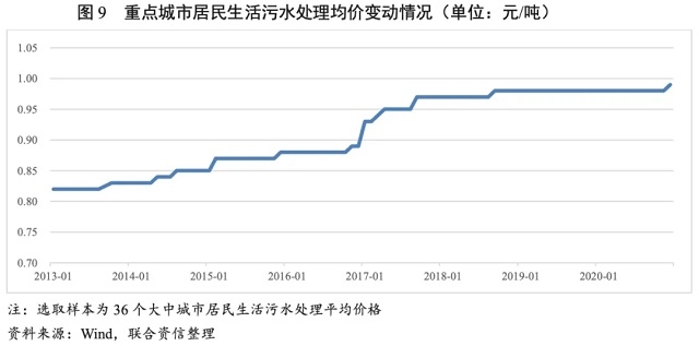 從污水處理價(jià)格來(lái)看,目前各地污水處理價(jià)格仍然由政府決定,價(jià)格整體仍然處于低位。根據(jù)國(guó)家發(fā)改委《關(guān)于制定和調(diào)整污水處理收費(fèi)標(biāo)準(zhǔn)等有關(guān)問(wèn)題的通知》(發(fā)改價(jià)格〔2015〕119號(hào)),污水處理收費(fèi)標(biāo)準(zhǔn)要補(bǔ)償污水處理和污泥處置設(shè)施的運(yùn)營(yíng)成本并合理盈利。城市污水處理收費(fèi)標(biāo)準(zhǔn)原則上居民應(yīng)不低于0.95元/噸,非居民不低于1.40元/噸。2020年,在全國(guó)省會(huì)城市和計(jì)劃單列市中,太原市城區(qū)污水處理收費(fèi)有所調(diào)整,居民用水污水處理收費(fèi)標(biāo)準(zhǔn)由0.50元/立方米調(diào)整為0.95元/立方米,其他省會(huì)城市和計(jì)劃單列市污水處理價(jià)格保持穩(wěn)定。近年來(lái),我國(guó)重點(diǎn)城市居民生活污水處理平均價(jià)格雖呈上升趨勢(shì),但該價(jià)格僅基本滿足國(guó)家規(guī)定收費(fèi)標(biāo)準(zhǔn)下限,并且居民生活污水處理費(fèi)排名靠后的城市例如拉薩、??凇⑸钲诘鹊?,污水處理價(jià)格處于0.80元/噸——0.90元/噸,尚未滿足國(guó)家規(guī)定收費(fèi)標(biāo)準(zhǔn)0.95元/噸。整體看,污水處理價(jià)格仍處低位,部分城市尚有較大上調(diào)空間。