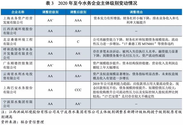 2020年以來(lái),69家存續(xù)發(fā)債水務(wù)樣本企業(yè)中有8家主體信用級(jí)別發(fā)生了變化,其中5家公司級(jí)別上調(diào),3家公司級(jí)別下調(diào)。