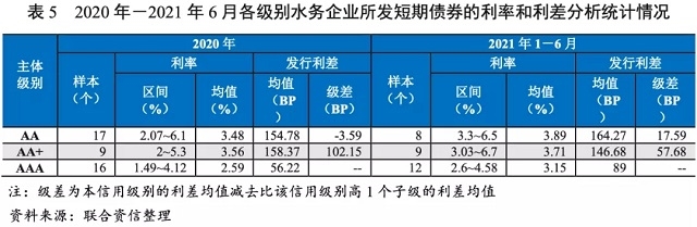 2019年至2021年6月,除AA級(jí)別水務(wù)企業(yè)債券發(fā)行利率波動(dòng)上升外,其他級(jí)別水務(wù)企業(yè)所發(fā)行不同期限債券利率均波動(dòng)下降。2020年,水務(wù)企業(yè)短期債券的平均發(fā)行利率為3.16%,較上年的3.80%大幅下降。2021年1——6月,水務(wù)企業(yè)短期債券平均發(fā)行利率(3.53%)較2020年有所上升,且較上年同期平均發(fā)行利率(2.97%)也有所上升。