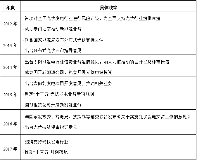 國(guó)家開發(fā)銀行作為政策性銀行,在這一時(shí)期,連續(xù)出臺(tái)多項(xiàng)光伏產(chǎn)業(yè)融資支持政策文件,并實(shí)際參與光伏產(chǎn)業(yè)投資。國(guó)家開發(fā)銀行總分行及其子公司國(guó)開金融、國(guó)銀租賃、國(guó)開證券為光伏產(chǎn)業(yè)提供了貸款、股權(quán)投資、融資租賃、債券發(fā)行等多種融資。2013年至2015年期間,國(guó)開行連續(xù)三年為光伏企業(yè)發(fā)放貸款超過(guò)200億人民幣,2016年為英利集團(tuán)提供25億元新增貸款,緩解其財(cái)務(wù)壓力,[35] 2017年為支持廣西首個(gè)光伏扶貧項(xiàng)目,國(guó)開行為其發(fā)放3億元貸款。[36]