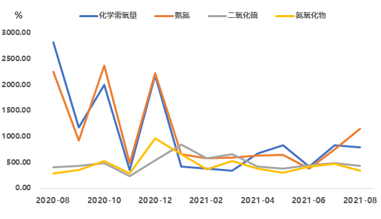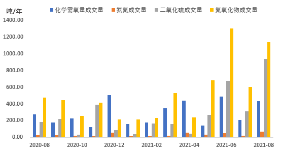 近期排污權成交量短期收窄后,再次攀升高位。2021年8月,四項排污權成交量合計為2576.36噸,環(huán)比上漲125.33%,與上年同期相比上升167.29%。