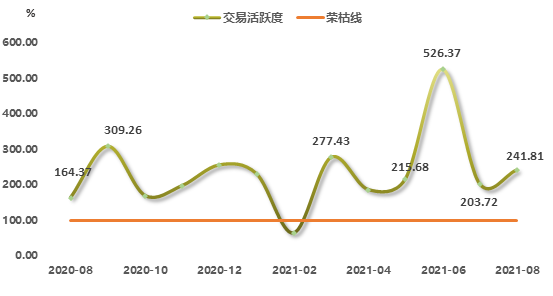 浙江省排污權交易活躍度小幅回暖。2021年8月,交易活躍度指數(shù)沖高回落后,出現(xiàn)小幅回暖走勢,指數(shù)值收報于241.81點,環(huán)比上漲18.69%,與上年同期相比上行47.11%。