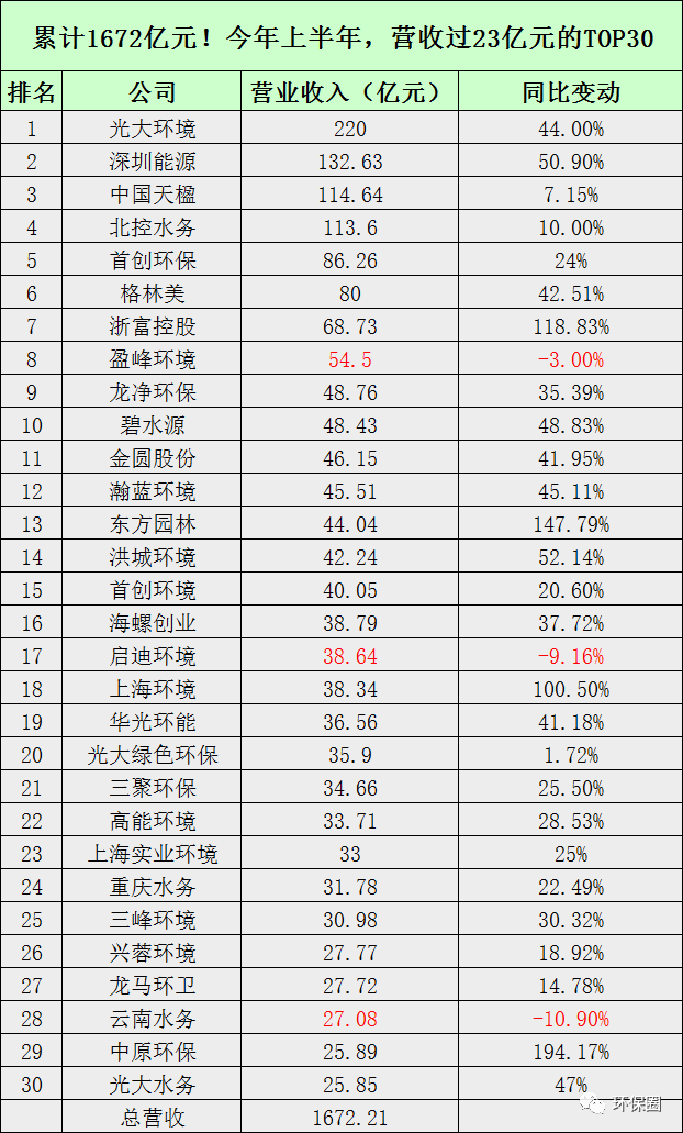 我們先看營收榜。今年上半年,111家環(huán)保上市企業(yè)累計實現(xiàn)總營收2443.77億元,相較于去年同期的2000億元,增加了22%,高于預(yù)期。