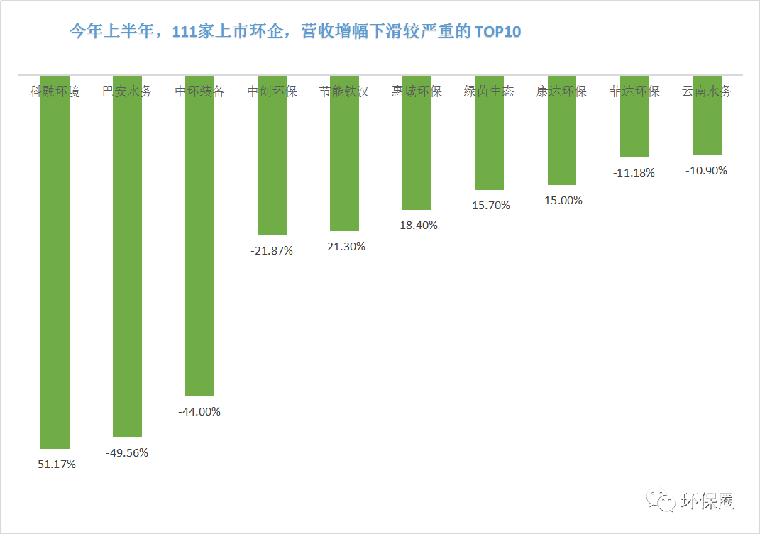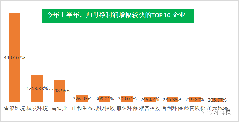 營收變動幅度方面,數(shù)據(jù)同樣喜人。111家上市環(huán)企,除了那些穩(wěn)步連續(xù)增長者,每年總有一些讓人意想不到的“黑馬”企業(yè)率先突圍出來,少則百分之幾百增長,多則百分之上千增長,成為上半年營收增速最快的10家先鋒企業(yè)。