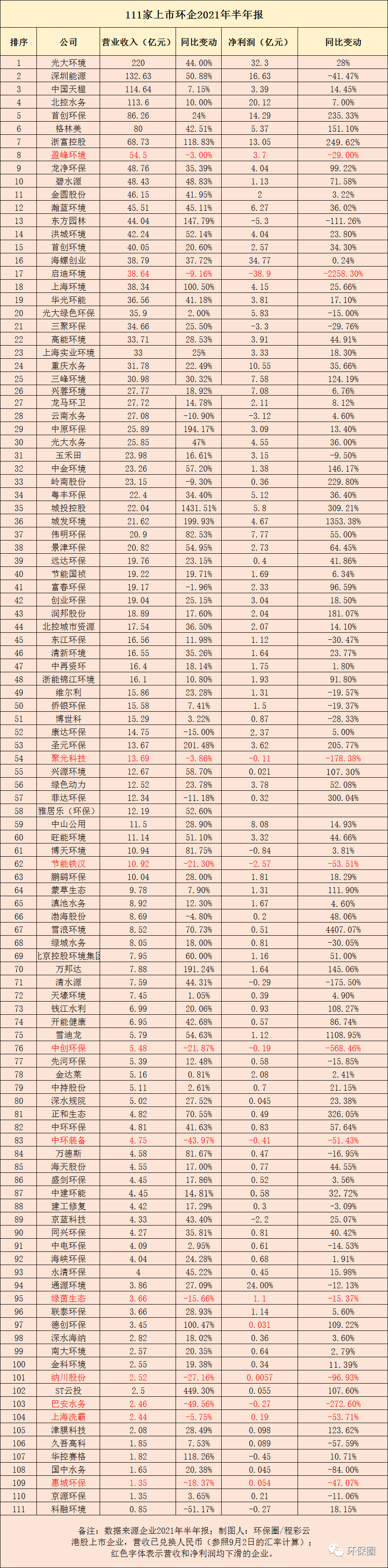 圖一:111家上市環(huán)保企業(yè)2021中報總體情況