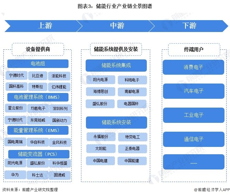 儲(chǔ)能產(chǎn)業(yè)鏈上游為電池、電池管理、能量管理系統(tǒng)以及儲(chǔ)能變流器供應(yīng)商;中游為儲(chǔ)能系統(tǒng)集成商、安裝商以及終端用戶等;下游為終端應(yīng)用客戶,包括風(fēng)/光/傳統(tǒng)電站、電網(wǎng)公司、家用儲(chǔ)能等。