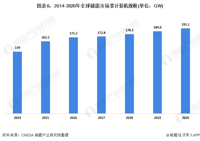 根據(jù)CNESA全統(tǒng)計(jì),截至2020年底,全球已投運(yùn)儲(chǔ)能項(xiàng)目累計(jì)裝機(jī)規(guī)模達(dá)到191.1GW,同比增長(zhǎng)3.4%。