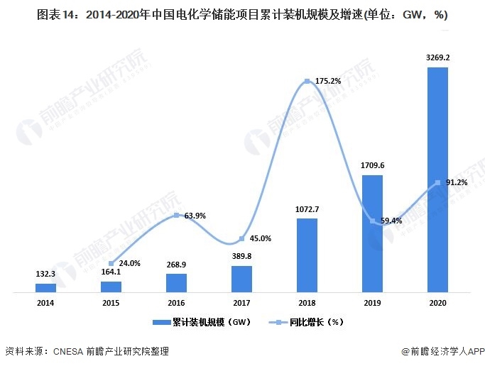 電化學(xué)儲(chǔ)能是利用化學(xué)電池將電能儲(chǔ)存起來(lái)并在需要時(shí)釋放的儲(chǔ)能技術(shù)及措施。在中國(guó)新能源發(fā)電規(guī)模大幅增長(zhǎng)、鋰電池成本持續(xù)下降推動(dòng)下,中國(guó)電化學(xué)儲(chǔ)能裝機(jī)規(guī)模一直保持高速增長(zhǎng)的趨勢(shì)。截至2020年底,電化學(xué)儲(chǔ)能累計(jì)裝機(jī)規(guī)模為3269.2MW,同比增長(zhǎng)91.2%。未來(lái)五年,隨著分布式光伏、分散式風(fēng)電等分布式能源的大規(guī)模推廣,電化學(xué)儲(chǔ)能行業(yè)將面臨更廣闊的市場(chǎng)機(jī)遇。