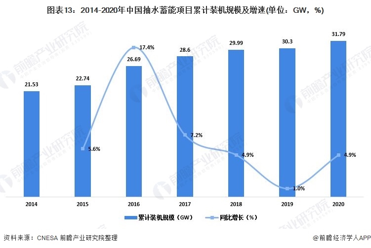 截至2020年底,我國(guó)抽水蓄能的累計(jì)裝機(jī)規(guī)模達(dá)到31.79GW,同比增長(zhǎng)4.9%。因抽水蓄能相對(duì)其他儲(chǔ)能方式成本較低,短期看來(lái),其在儲(chǔ)能應(yīng)用中的主導(dǎo)地位不會(huì)被動(dòng)搖。