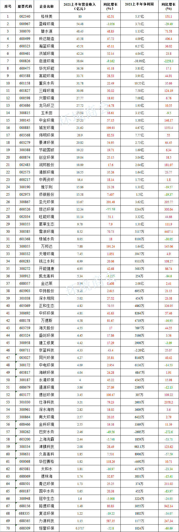 其中,清新環(huán)境2021年1-6月實(shí)現(xiàn)營業(yè)收入16.55億元,同比增長35.26%,歸屬于上市公司股東的凈利潤為1.64億元,同比增長23.77%,每股收益為0.1322元。(詳情請(qǐng)點(diǎn)擊:)高能環(huán)境持續(xù)聚焦主業(yè),固廢危廢資源化利用業(yè)務(wù)開展順利,收入及利潤較上期均有較大增長。年報(bào)顯示,公司上半年實(shí)現(xiàn)營收...