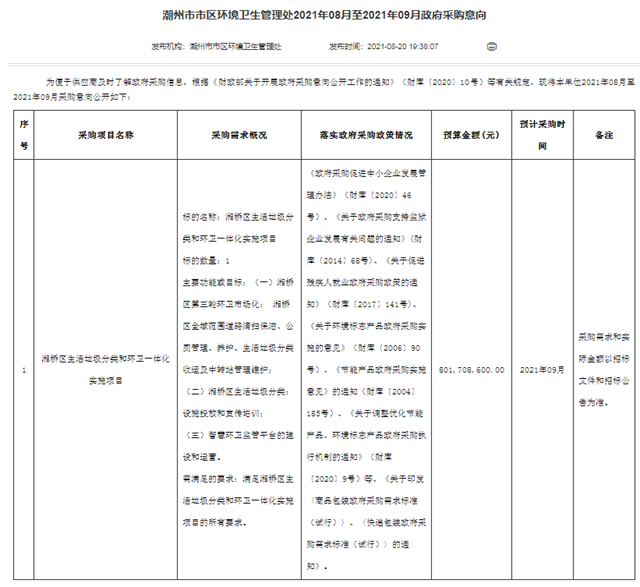近日,中國固廢網(wǎng)從E20標(biāo)訊系統(tǒng)E標(biāo)通獲悉,廣東省潮州市將于9月份公開采購兩個(gè)環(huán)衛(wèi)項(xiàng)目,總投資超過10億!兩項(xiàng)目分別為湘橋區(qū)生活垃圾分類和環(huán)衛(wèi)一體化實(shí)施項(xiàng)目和楓溪區(qū)生活垃圾分類和環(huán)衛(wèi)一體化實(shí)施項(xiàng)目,預(yù)算金額分別為80170.86萬元和27852.86萬元。 項(xiàng)目:湘橋區(qū)生活垃圾分類和環(huán)衛(wèi)一體化實(shí)施項(xiàng)...