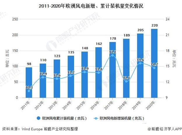 1、歐洲風(fēng)電裝機(jī)量不斷提升 早在20世紀(jì)90年代初,歐盟就提出了大力發(fā)展風(fēng)電的計(jì)劃和目標(biāo),發(fā)展至今,風(fēng)電已成歐洲最廉價(jià)發(fā)電模式。數(shù)據(jù)顯示,2011-2020年,歐洲風(fēng)電累計(jì)裝機(jī)量由98吉瓦增長至220吉瓦,同時(shí)每年新增裝機(jī)量也不斷提升。2020年,歐洲新增風(fēng)電裝機(jī)14.7兆瓦,受疫情影響較2019年...